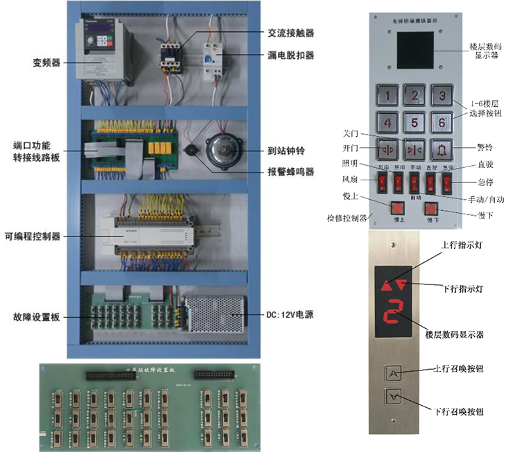 電梯電氣控制部分:電源空氣開關(guān)(漏電脫扣器)、DC12V驅(qū)動電源、PLC可編程控制器、接線端口電路板、到站鐘、變頻器、報警蜂鳴器。