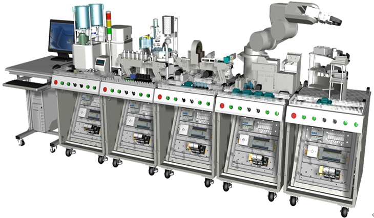 機電一體化綜合實訓考核系統(tǒng)是基于國家中長期人才發(fā)展規(guī)劃綱要,對經(jīng)濟社會發(fā)展重點領域急需緊缺專門人才培養(yǎng)的需要,依據(jù)國家相關職業(yè)工種培養(yǎng)及鑒定標準,結合中國當前制造業(yè)的崗位需求設計研發(fā)。機電一體化綜合實訓考核系統(tǒng)由“工作站”形式綜合體現(xiàn),“工作站”包含機電一體化“工作島”,電氣裝配臺,機械裝配臺,工具、資料柜及其他附屬工作設施,不但讓操作者在工作中實習訓練了機電專業(yè)技能,同時也體驗到職業(yè)素養(yǎng)中的社會能力與方法能力。“工作站”的核心是“工作島”,由MPS模塊化生產(chǎn)線設備組成,共分為液體混合灌裝、組裝加工、檢測判別、機器人和智能倉儲五個工作島設備組成,工作島由PLC、變頻器、伺服驅動、步進驅動、氣動元件、觸摸屏等工業(yè)控制器件構成,操作者需要具備機械裝調(diào)、電氣管路連接、程序設計、機器人操作、傳感器裝調(diào)、檢修排故、觸摸屏組態(tài)等現(xiàn)代制造業(yè)崗位必要的技能,設備技術涵蓋面廣,定位具有前瞻性,是機電一體化專業(yè)教學實習、技能鑒定和技能競賽的絕佳載體。