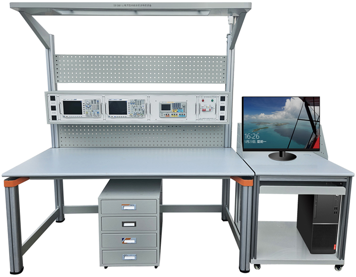 電子技術綜合實訓考核設備主要由工作臺、實訓屏、實訓屏模塊、工具柜、電路實訓模塊、儀器工具耗材包組成。桌身采用鋁型材,桌面采用25mm厚高密度纖維板,外貼防火板,PVC截面封邊。工作臺設有防靜電配套裝置,桌面上方有實訓屏、模塊盒安放橫梁、工具網孔板、高檔條形LED照明。