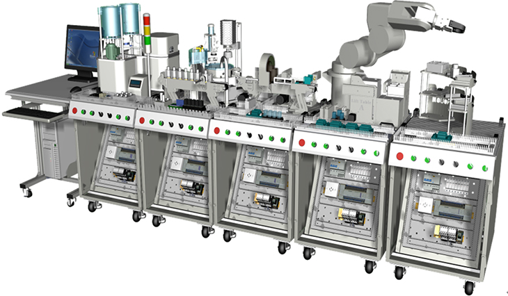 機(jī)電一體化綜合實(shí)訓(xùn)考核系統(tǒng)是基于國(guó)家中長(zhǎng)期人才發(fā)展規(guī)劃綱要,對(duì)經(jīng)濟(jì)社會(huì)發(fā)展重點(diǎn)領(lǐng)域急需緊缺專門(mén)人才培養(yǎng)的需要,依據(jù)國(guó)家相關(guān)職業(yè)工種培養(yǎng)及鑒定標(biāo)準(zhǔn),結(jié)合中國(guó)當(dāng)前制造業(yè)的崗位需求設(shè)計(jì)研發(fā)。機(jī)電一體化綜合實(shí)訓(xùn)考核系統(tǒng)由"工作站"形式綜合體現(xiàn),"工作站"包含機(jī)電一體化"工作島",電氣裝配臺(tái),機(jī)械裝配臺(tái),工具、資料柜及其他附屬工作設(shè)施,不但讓操作者在工作中實(shí)習(xí)訓(xùn)練了機(jī)電專業(yè)技能,同時(shí)也體驗(yàn)到職業(yè)素養(yǎng)中的社會(huì)能力與方法能力。"工作站"的核心是"工作島",由MPS模塊化生產(chǎn)線設(shè)備組成,共分為液體混合灌裝、組裝加工、檢測(cè)判別、機(jī)器人和智能倉(cāng)儲(chǔ)五個(gè)工作島設(shè)備組成,工作島由PLC、變頻器、伺服驅(qū)動(dòng)、步進(jìn)驅(qū)動(dòng)、氣動(dòng)元件、觸摸屏等工業(yè)控制器件構(gòu)成,操作者需要具備機(jī)械裝調(diào)、電氣管路連接、程序設(shè)計(jì)、機(jī)器人操作、傳感器裝調(diào)、檢修排故、觸摸屏組態(tài)等現(xiàn)代制造業(yè)崗位必要的技能,設(shè)備技術(shù)涵蓋面廣,定位具有前瞻性,是機(jī)電一體化專業(yè)教學(xué)實(shí)習(xí)、技能鑒定和技能競(jìng)賽的絕佳載體。