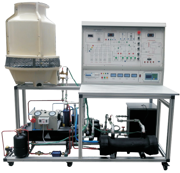 活塞式冷水機(jī)組電氣實訓(xùn)智能實驗裝置敞開式設(shè)計,安裝有制冷管路設(shè)備