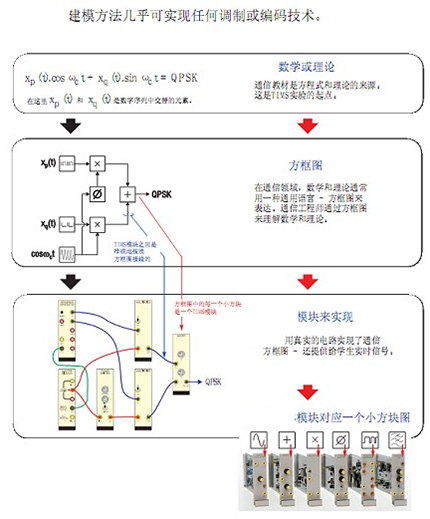 通信系統(tǒng)原理實驗室主要設備采用設計型開放式設計理念,跟以往驗證型實驗設備有本質(zhì)區(qū)別。整個系統(tǒng)采用基于方框圖的模塊化設計,以數(shù)學函數(shù)方框圖形式來確定硬件基本模塊,靈活組合模塊以實現(xiàn)任何調(diào)制或編碼技術。