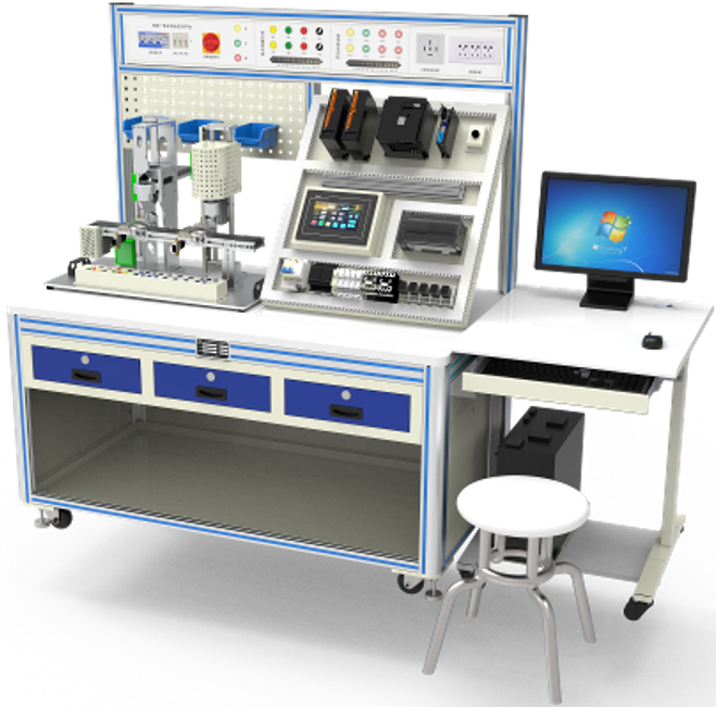 機(jī)電一體化實(shí)訓(xùn)工作站包含實(shí)訓(xùn)平臺(tái)、控制掛板、應(yīng)用模塊、電腦桌、圓凳三部分組成,實(shí)訓(xùn)平臺(tái)采用優(yōu)質(zhì)鋁型材做骨架,鋁型材立柱與實(shí)訓(xùn)桌面連接。左右兩側(cè)及后面封裝優(yōu)質(zhì)鋼板,正面設(shè)計(jì)儲(chǔ)物柜與抽屜。