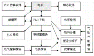 光機(jī)電一體化實訓(xùn)裝置由型材導(dǎo)軌式實訓(xùn)臺,典型機(jī)電一體化設(shè)備機(jī)械部件,PLC模塊,變頻器模塊,按鈕模塊,電源模塊,低壓電器模塊,模擬生產(chǎn)設(shè)備實訓(xùn)模塊(包含上料機(jī)構(gòu),搬運機(jī)械手,皮帶輸送線,物件分揀等)接線端子排,各種傳感器,警示燈和氣動電磁閥等組成。整體結(jié)構(gòu)采用開放式和拆裝式設(shè)計,學(xué)生可以組裝,接線,編程和調(diào)試由上料機(jī)構(gòu),搬運機(jī)械手機(jī)構(gòu),皮帶輸送線和物料分揀組成的光機(jī)電一體化設(shè)備。裝置的總體結(jié)構(gòu)示意圖如圖主所示。