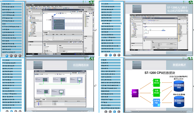 配有S7-1200 PLC學(xué)習(xí)軟件,方便老師教學(xué),提供有功能與特點(diǎn)、模塊安裝、選型、工作原理、支持的數(shù)據(jù)類(lèi)型、數(shù)據(jù)的存取方式、程序結(jié)構(gòu)、編程軟件的安裝、編程軟件界面介紹、硬件的組態(tài)、入門(mén)實(shí)例、PLC變量表的使用、使用交叉引用、組織塊使用示例、基本位邏輯指令、上升沿-下降沿指令、置位-復(fù)位指令、接通延時(shí)定時(shí)器、比較指令、移位-循環(huán)移位指令、基本邏輯運(yùn)算指令、數(shù)據(jù)塊概述等50多個(gè)學(xué)習(xí)項(xiàng)目。PLC學(xué)習(xí)軟件參考界面如下:
