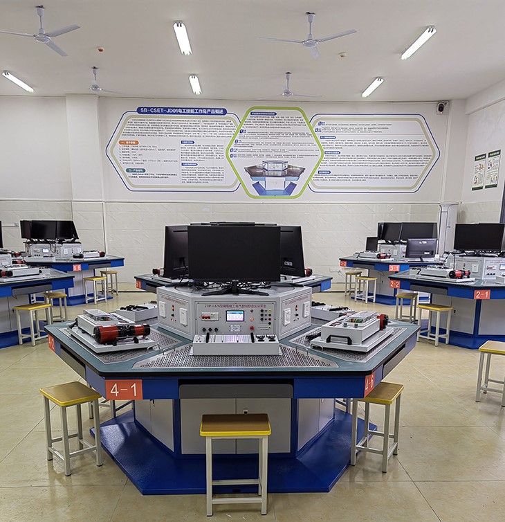 技能工作島由六邊形工作臺、六邊形電源控制屏及典型工作任務(wù)組成,能同時(shí)容納6名學(xué)生在設(shè)備上進(jìn)行操作。