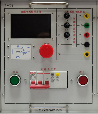 (1)提供線電壓380V交流電源、相電壓220V交流電源。交流電源輸出設(shè)有電源保護(hù)系統(tǒng),相間、線間過(guò)電流及直接短路均能自動(dòng)保護(hù)。提供三相漏電保護(hù)器作為整個(gè)實(shí)驗(yàn)平臺(tái)的電源總開(kāi)關(guān)。三相輸出通過(guò)停止和啟動(dòng)按鈕控制。