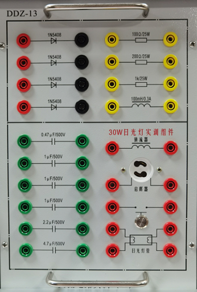 提供0.22uF/500V、0.47uF/500V、1uF/500V(三只)、2.2uF/500V、4.7uF/500V高壓電容、鎮(zhèn)流器、啟輝器、日光燈等,高壓電容可通過(guò)鈕子開(kāi)關(guān)控制,完成日光燈電路連接和功率因數(shù)提高實(shí)驗(yàn)。