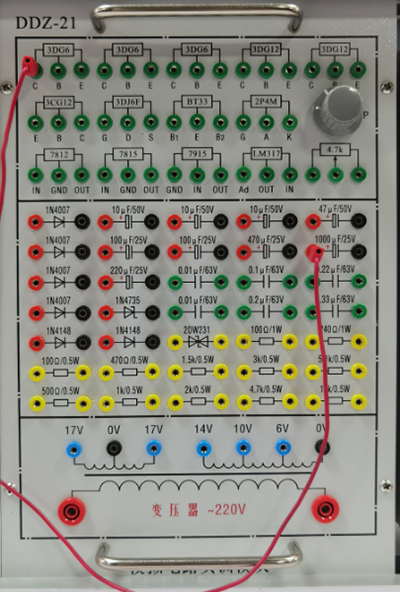 提供低壓交流電源(0V、6V、10V、14V抽頭各一路及中心抽頭17V兩路)、三極管(3DG6、3DG12、3CG12)、二極管(1N4007、1N4148)、穩(wěn)壓塊(7812、7815、7915、LM317)、電阻、單結(jié)晶體管、蜂鳴器、電容等。配有相關(guān)實(shí)驗(yàn)元器件。