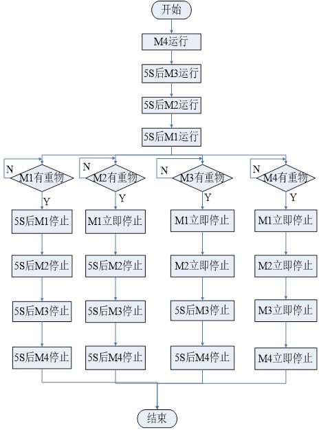 2.為防止物料在皮帶上滯留,應(yīng)按照物料傳送方向順序停車,停止順序為M1、M2、M3、M4,間隔5秒。