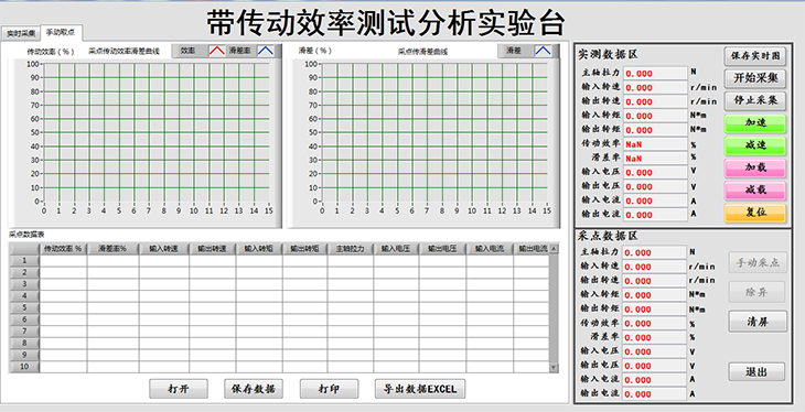 2、通過觸摸屏顯示面板顯示面板讀數(shù)進(jìn)行平皮帶傳動效率的測定,人工繪制滑差曲線和效率曲線。