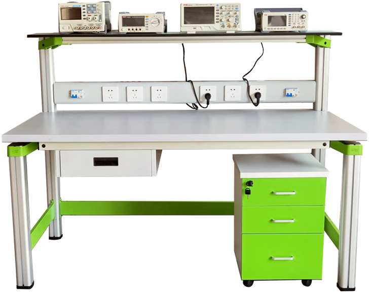 實(shí)驗(yàn)桌規(guī)格為1500mm(長)*700mm(寬)*1150mm(高),設(shè)有一個(gè)抽屜。實(shí)驗(yàn)桌主體結(jié)構(gòu)全部采用高性能表面氧化的鋁型材及一次成型鋁壓鑄框架連接構(gòu)件,連接構(gòu)件采用壓鑄成型工藝(非焊接工藝),經(jīng)機(jī)加工、拋丸、噴砂,表面靜電噴涂工藝,安裝方便、快捷,用戶可自行DIY組裝。桌體立柱采用工業(yè)鋁型材成型工藝,表面氧化處理,截面尺寸:70mm×70mm,四面帶槽,槽寬約8mm,端部裝有注塑成型配套塑料堵頭。桌面采用25mmE1級(jí)三聚氰胺飾面板,桌面板下設(shè)支撐框架,承受力不少于300kg。配備儲(chǔ)存柜,存放元件及工具,儲(chǔ)存柜底部4只高強(qiáng)度萬向可制動(dòng)PU腳輪,方便移動(dòng)。實(shí)訓(xùn)裝置整體簡約不簡單,高端大氣,符合現(xiàn)代化產(chǎn)品審美和發(fā)展趨勢。