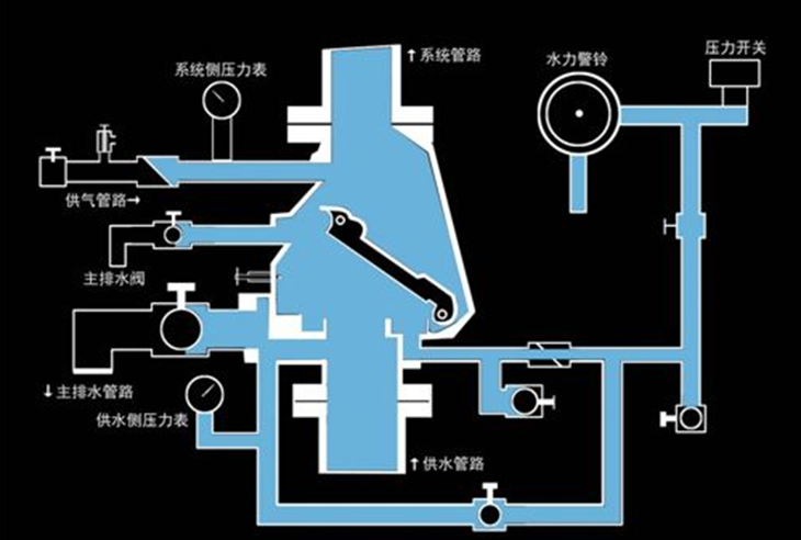 當(dāng)系統(tǒng)處于伺應(yīng)狀態(tài)時,座圈上的溝槽小孔被閥瓣蓋住封閉,通往水力警鈴的報警水道被堵死;當(dāng)上、下壓力差達(dá)到一定數(shù)值,閥瓣才開啟(差壓啟動),水就從供水側(cè)流向系統(tǒng)側(cè),警鈴報警,滅水系統(tǒng)噴水;當(dāng)上、下壓力頻繁開啟,在閥瓣上設(shè)有小補(bǔ)水閥,當(dāng)系統(tǒng)側(cè)管網(wǎng)有微小滲漏或水源壓力有波動時,可以通過補(bǔ)水閥給管網(wǎng)補(bǔ)水,平衡上、下腔壓力,穩(wěn)定了閥瓣,從而避免了誤報警。