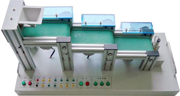 模型主要由漏斗上料裝置、三級傳送帶、直流電機、電磁鐵、電容傳感器、開關(guān)、指示燈、鋁型材框架、安裝底板、手柄等組成,通過PLC編程,可完成自動送料裝車系統(tǒng)的模擬控制。
