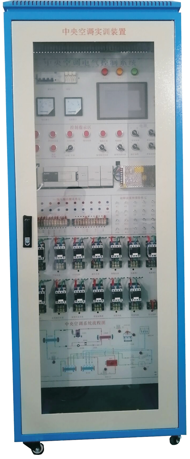 鐵質(zhì)雙層亞光密紋噴塑結(jié)構(gòu),結(jié)構(gòu)堅(jiān)固。前門采用透明設(shè)計(jì),可觀察到中央控制器、接觸器、熱保護(hù)器等控制元件。面板上面有控制開關(guān)旋鈕、工作狀態(tài)指示燈、系統(tǒng)流程圖及PLC主機(jī)單元及測(cè)試點(diǎn)。