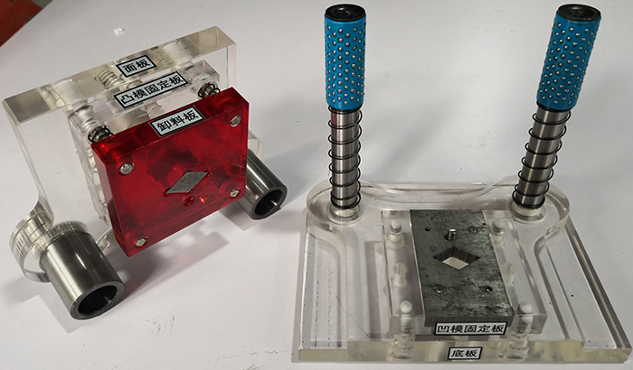 把板材料沿直線彎成各種形狀,可以加工形狀較復雜的零件。 以菱形工件作為導料,彎曲高度不小于10 mm,產品自動從凸模脫落。 |
