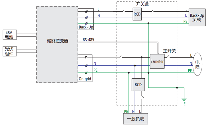 Ø 夜晚,光伏側(cè)直流停機(jī),由儲(chǔ)能電池通過(guò)儲(chǔ)能逆變器單獨(dú)給負(fù)載供電,當(dāng)電池剩余容量(SOC)放到設(shè)定值,系統(tǒng)自動(dòng)切入電網(wǎng),由電網(wǎng)給負(fù)載供電,根據(jù)需求,電網(wǎng)可以通過(guò)儲(chǔ)能逆變器給電池充電,也可以不充電;