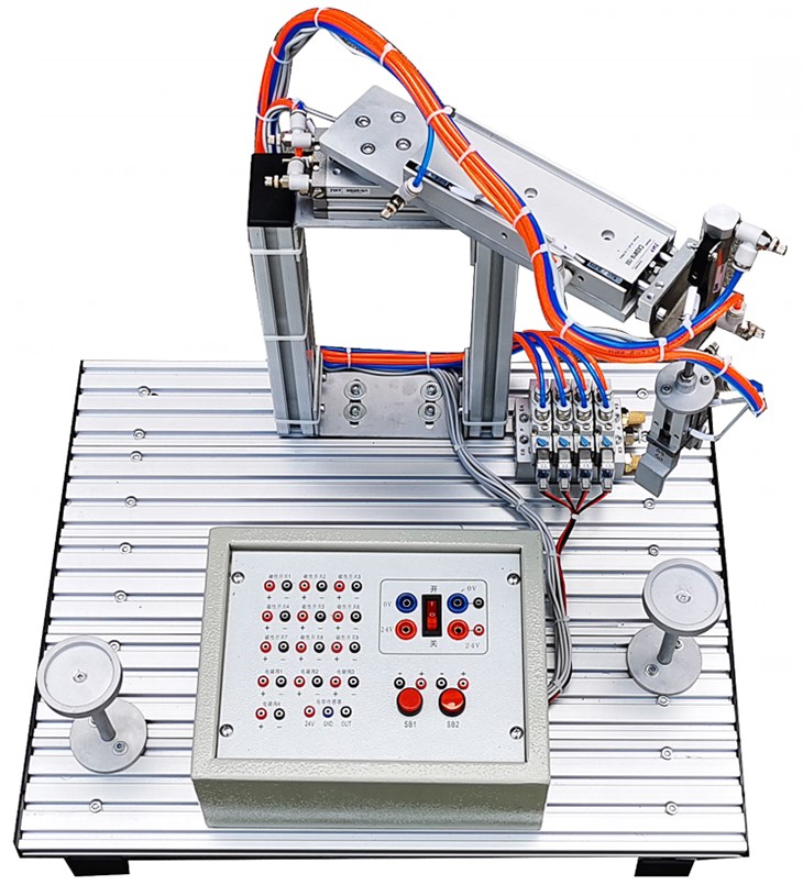 17、氣動(dòng)機(jī)械手實(shí)訓(xùn)模型(實(shí)物):本實(shí)訓(xùn)模型是一套完整的氣動(dòng)機(jī)械手搬運(yùn)裝置,由安裝底板、氣動(dòng)手指、單桿提升氣缸、雙導(dǎo)桿伸縮氣缸、旋轉(zhuǎn)擺動(dòng)氣缸、多種類型磁性傳感器、多種類型電磁閥、空氣過濾器、氣源控制滑閥及接線端子排等組成。主要完成物料的搬運(yùn)功能,氣動(dòng)機(jī)械手通過前臂下降,氣動(dòng)手指夾緊物體,手臂縮回,手臂右擺,手臂前伸,前臂下降,手爪松開將物體放到指定位置等動(dòng)作后,機(jī)械手返回原位。將電磁閥及磁性開關(guān)等元件的引出線連接到相應(yīng)的端子接線排上,方便使用。能滿足職業(yè)院?删幊炭刂破、機(jī)電一體化、氣動(dòng)技術(shù)等相關(guān)課程的實(shí)訓(xùn)教學(xué)、控制電源:DC