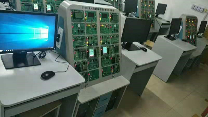 6)平臺(tái)下端兩側(cè)擺放電腦主機(jī),主機(jī)中間另有兩個(gè)抽屜存放實(shí)驗(yàn)器材。雙工位同步教學(xué)實(shí)驗(yàn)裝置。平臺(tái)上部擺放2個(gè)工位的專業(yè)課程教學(xué)模塊至少有12塊,分體式結(jié)構(gòu)、模塊化設(shè)計(jì),可根據(jù)教學(xué)任務(wù)的不同進(jìn)行模塊更換;