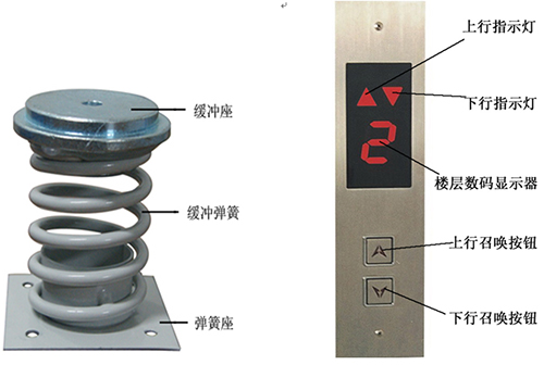 電梯井道部分:導(dǎo)軌、對重機(jī)構(gòu)、轎廂(門機(jī)機(jī)構(gòu)、安全鉗、導(dǎo)靴、照明燈、風(fēng)扇)、層門、樓層召喚指示控制器、曳引繩、導(dǎo)向輪、上(下)強(qiáng)慢開關(guān)、上(下)限位開關(guān)、上(下)極限開關(guān)、隨行電纜、轎廂控制器、緩沖器。