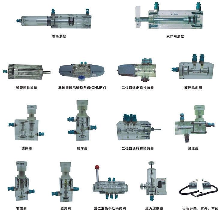 4、實(shí)訓(xùn)元件均為透明有機(jī)材料制成,便于了解掌握幾十種常用液壓元件的結(jié)構(gòu),性能及用途。掌握幾十種基本回路的工作原理,實(shí)驗(yàn)組裝回路快捷、方便。