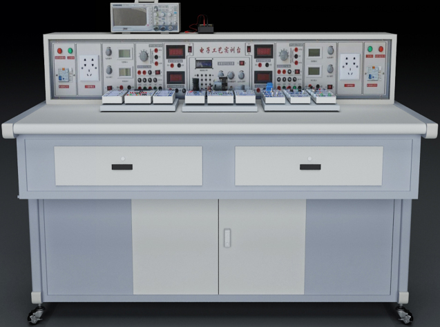 實訓桌為鐵質雙層亞光密紋噴塑結構,桌面為防火、防水、耐磨高密度板,結構堅固。實訓桌下方設有柜子,可以放置實訓模塊和工具以及資料等,還設有四個帶剎車的輪子,便于移動和固定。