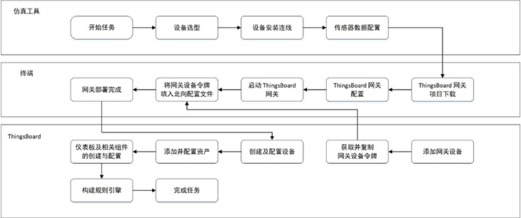 智慧溫室案例,引入了ThingsBoard IoT Gateway開(kāi)源解決方案,在AIoT平臺(tái)的仿真工具中部署ThingsBoard gateway網(wǎng)關(guān),以連接ThingsBoard云平臺(tái),便于上送溫濕度傳感器數(shù)據(jù),搭建恒溫機(jī)執(zhí)行器模塊;ThingsBoard平臺(tái),用戶可在儀表盤內(nèi)添加設(shè)置智慧溫室場(chǎng)景、溫濕度顯示設(shè)備等組件,獲取仿真實(shí)驗(yàn)中上送的虛擬數(shù)據(jù),以動(dòng)態(tài)曲線的形式作可視化呈現(xiàn);用戶還可根據(jù)案例要求,在ThingsBoard平臺(tái)的規(guī)則鏈庫(kù)中,自主編輯設(shè)定規(guī)則引擎,實(shí)現(xiàn)智慧溫室的恒溫控制與異常告警。