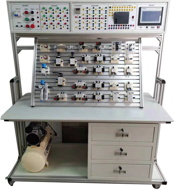 2、實訓(xùn)桌主框架為型材結(jié)構(gòu)、實訓(xùn)臺與儲物柜為鐵質(zhì)雙層亞光密紋噴塑結(jié)構(gòu),儲物柜內(nèi)存放氣動元件及資料等。
