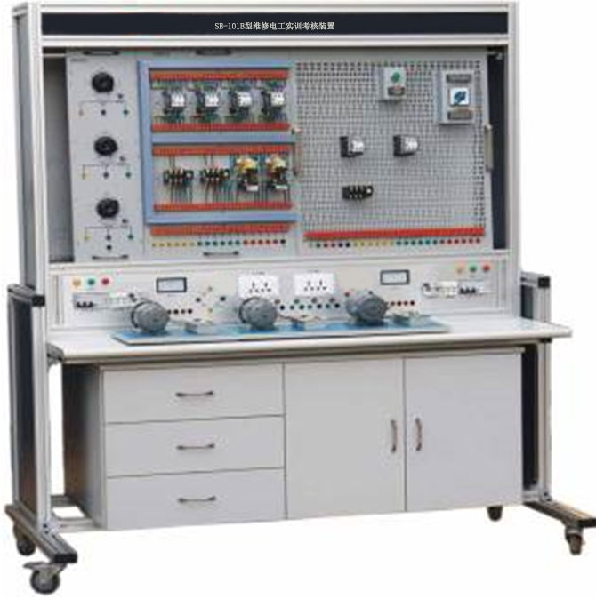 維修電工實訓(xùn)考核實訓(xùn)臺由上支架/實訓(xùn)屏(內(nèi)置電源)、實訓(xùn)桌子、實訓(xùn)儲物柜三大部分組成。以經(jīng)氧化處理的高材質(zhì)35mm×35mm鋁合金作為設(shè)備主要連接材料;兩側(cè)及電源箱體采用麻黑色15mm層壓板制作;上支架的不銹鋼管材與電源箱體上的鋁合金型槽組合成維修電工通用掛板固定結(jié)構(gòu),改變實訓(xùn)內(nèi)容需要移動掛板時,可方便地在型槽中滑動,以便更好地配合實訓(xùn);桌面采用25mm麻灰色高密度層壓板封邊特制,有效提高絕緣等級;實訓(xùn)儲物柜采用標(biāo)準(zhǔn)結(jié)構(gòu)和抽屜式用于存放工具以及實訓(xùn)資料,右側(cè)的拉門式設(shè)計同時可存放兩塊通用掛板。