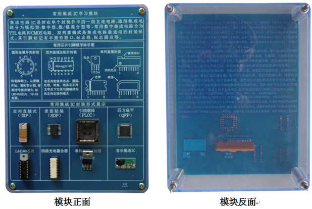 底盒使用190mm×145mm的開模有機(jī)透明塑料底盒,模塊面板采用印制電路板PCB工藝,可以直觀看到器件的實(shí)物及相關(guān)的原理介紹。方便感性認(rèn)識(shí)、檢測(cè)測(cè)試,同時(shí)也能防止器件的損傷。
