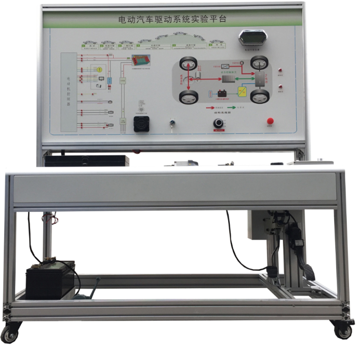 檢測控制面板(裝有各種檢測端子,1448×940mm彩色電路圖和工作原理示意圖)、組合儀表、點火開關(guān)、電機控制器、車載充電器與充電接口、DC-DC轉(zhuǎn)換器、鋰動力電池組、電動車電機(直流無刷電機)與變速箱、后輪左右液壓制動裝置、驅(qū)動橋傳動裝置、剎車開關(guān)、檔位開關(guān)、油門控制裝置、大電流繼電器、電源總開關(guān)、急停開關(guān)、輔助蓄電池(12V45AH)、一體化全鋁合金型材搭建的移動臺架(1500×700×1700mm
