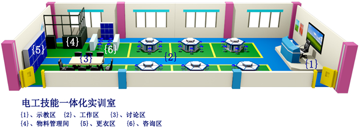 技能工作島由六邊形工作臺、六邊形電源控制屏及典型工作任務組成,能同時容納6名學生在設備上進行操作。