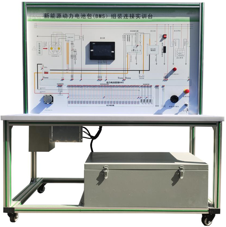 磷酸鐵鋰動(dòng)力電池包、實(shí)驗(yàn)連接導(dǎo)線(xiàn)、BMS鋰電管理一體機(jī)、7寸動(dòng)力電池包觸摸顯示屏、車(chē)載充電機(jī)、國(guó)標(biāo)充電插口、國(guó)標(biāo)充電槍、緊急斷電開(kāi)關(guān)、霍爾電流傳感器、直流接觸器(包含充電繼電器、總正繼電器、總負(fù)繼電器、預(yù)充繼電器)、DC-DC轉(zhuǎn)換器、輔助蓄電池(12V45AH)、放電控制繼電器與放電負(fù)載、預(yù)充電阻、一體化全鋁合金型材搭建的移動(dòng)臺(tái)架(1500×700×1700mm 帶自鎖腳輪裝置,帶安裝檢測(cè)端子的原理面板,面板1448×940mm)、設(shè)備操作說(shuō)明書(shū)。