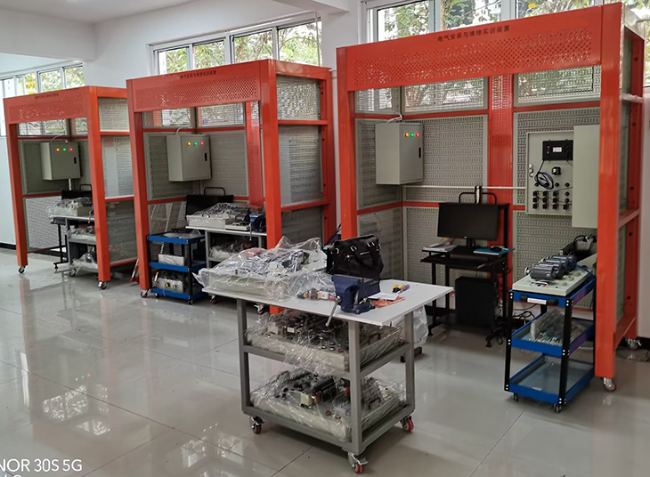 電氣安裝與維修實(shí)訓(xùn)考核裝置,可進(jìn)行電工安裝。如橋架安裝、PVC管安裝、白熾燈座、日光燈、開關(guān)、插座、配電箱、控制箱等,裝置還包含有交流異步電動(dòng)機(jī)、直流電動(dòng)機(jī)、步進(jìn)電機(jī)、伺服電機(jī)、溫度控制器、電偶、PLC、變頻器觸摸屏等控制與受控對(duì)象。該系統(tǒng)每個(gè)操作組配套一可移動(dòng)式工具車和元件柜,便于對(duì)元件的保管和安裝施工。從根本上解決了學(xué)校在普通墻面上進(jìn)行的安裝培訓(xùn)的使用不方便、實(shí)訓(xùn)范圍窄的問題。