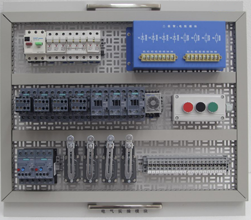 1)采用厚網(wǎng)孔板,工業(yè)灰噴塑,面板安裝一線品牌的電器元件(空氣開關(guān)、熔斷器、交流接觸器、時(shí)間繼電器、熱繼電器、按鈕、指示燈、接線端子等)。實(shí)操模塊具有快速拆裝等優(yōu)點(diǎn),與實(shí)訓(xùn)臺(tái)桌面具有一定角度安裝,符合人體視覺?梢詽M足電工(中級(jí)、高級(jí))、機(jī)電考核、技能鑒定等功能。