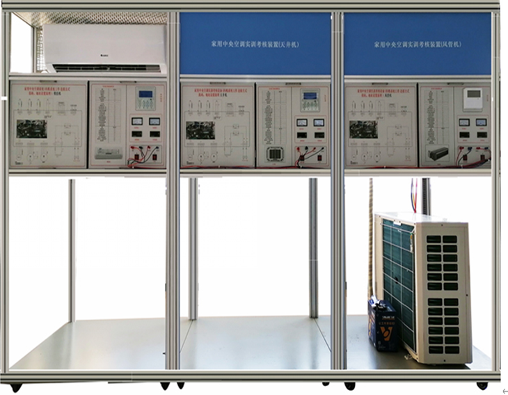 充分地展示了家用中央空調(diào)的結(jié)構(gòu)形式、控制原理、系統(tǒng)不同工況時(shí)的參數(shù)變化及空調(diào)制冷系統(tǒng)流程圖。數(shù)碼一拖三機(jī)組1套:空調(diào)系統(tǒng)采用市場(chǎng)數(shù)碼機(jī)組,室內(nèi)機(jī)有終端處理機(jī)組組成。天井式(嵌入式)1套、掛壁式1套、風(fēng)機(jī)盤管1套組成室內(nèi)終端機(jī)組處理系統(tǒng);讓學(xué)生了解室內(nèi)機(jī)組多樣化的結(jié)構(gòu)形式。每個(gè)終端機(jī)組處理系統(tǒng)都是相互獨(dú)立的。