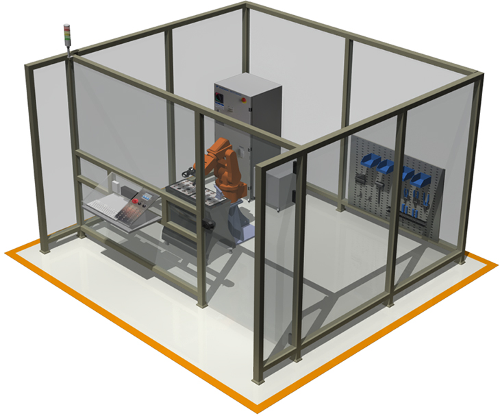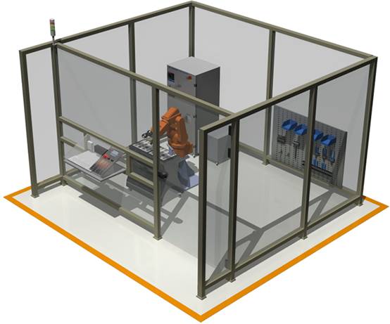 安全護(hù)欄:隔離護(hù)欄,高1000mm,框架采用2mm厚灰色棟梁鋁合金型材,鋼化玻璃10mm厚;工作站全部通透利于觀察,玻璃中間沒(méi)有隔斷;并安裝一個(gè)側(cè)開(kāi)門(mén);門(mén)上安裝安全檢測(cè)元件,機(jī)器人自動(dòng)運(yùn)行必須在門(mén)關(guān)閉狀態(tài)下進(jìn)行;系統(tǒng)工作站安裝有3個(gè)急停按鈕,分別位于操作控制臺(tái)、模型安裝臺(tái)、隔離護(hù)欄上,以備緊急情況使用。