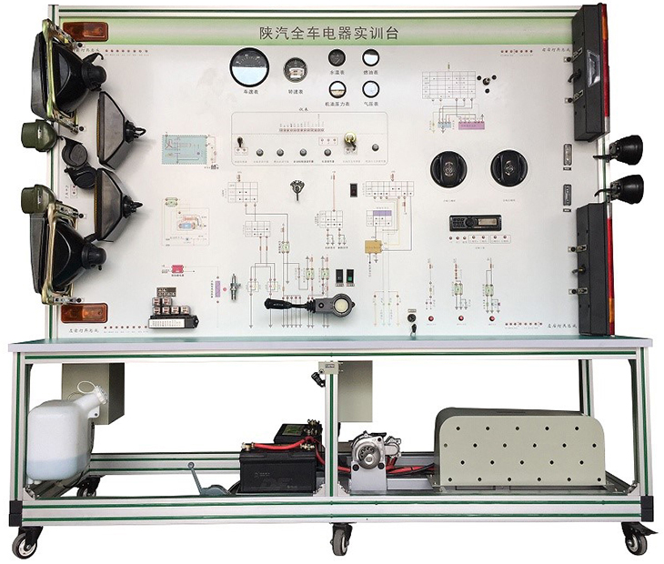 全車電器電路實訓(xùn)設(shè)備采用陜汽SX2220柴油機整車電器實物為基礎(chǔ),充分展示汽車儀表系統(tǒng)、燈光系統(tǒng)、雨刮系統(tǒng)、喇叭系統(tǒng)、發(fā)動機電器系統(tǒng)、起動系統(tǒng)和充電系統(tǒng)等汽車電器各系統(tǒng)的組成結(jié)構(gòu)和工作過程。