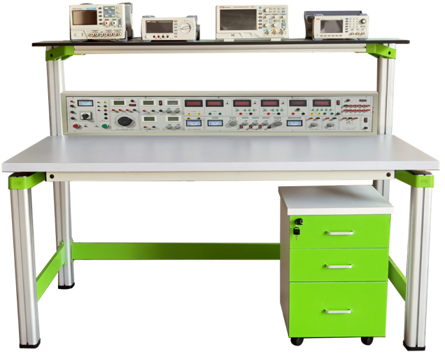 電源儀表控制屏箱體采用鐵質(zhì)雙層亞光密紋噴塑結(jié)構(gòu),鋁質(zhì)面板。左邊是安全控制、交直流電源、信號源、測量電表等;電源儀表控制屏箱底部裝有日光燈,用作日光燈實驗。右邊是示波器等儀器放置箱,并配有多組外部儀器交流工作電源箱。