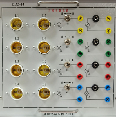 提供四組負(fù)載和四組獨(dú)立的電流插座。每組負(fù)載由兩個(gè)獨(dú)立的白熾燈螺口燈座組成(每組設(shè)有一個(gè)開關(guān)與一個(gè)電流插座)?刹60W以下的白熾燈八只。能夠完成三相交流電路實(shí)驗(yàn)。