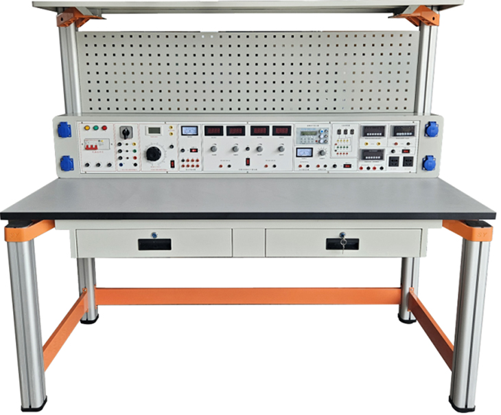 實訓桌后面二支截面尺寸70×70mm桌腳向上延伸,與一次成型鋁壓鑄框架連接構件構成(非焊接工藝)牢固的支架,與網(wǎng)孔工具掛板、儀器架、電源控制箱組成一個完整的實訓屏。