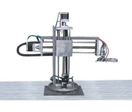 4. 搬運(yùn)機(jī)器人:檢測(cè)單元檢測(cè)到產(chǎn)品分類信息時(shí),通過通信網(wǎng)絡(luò)將檢測(cè)結(jié)果傳送到該站,該站通過坐標(biāo)式氣動(dòng)機(jī)器人將從生產(chǎn)線上送來的成品送往全自動(dòng)堆垛機(jī),主要由四自由度氣動(dòng)機(jī)械手組成,電氣控制部分由PLC完成。