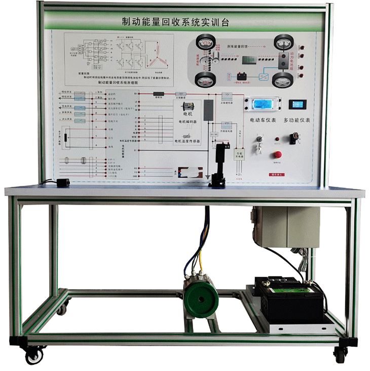 檢測控制面板(裝有各種檢測端子,1448×940mm彩色電路圖和工作原理示意圖)、儀表、點火開關、電機控制器、車載充電器與充電接口、DC-DC轉換器、鋰動力電池組、電動車電機、剎車開關、上位機軟件、檔位開關、油門控制裝置、大電流繼電器、電源總開關、急停開關、輔助蓄電池(12V45AH)、一體化全鋁合金型材搭建的移動臺架(1500×700×1700mm