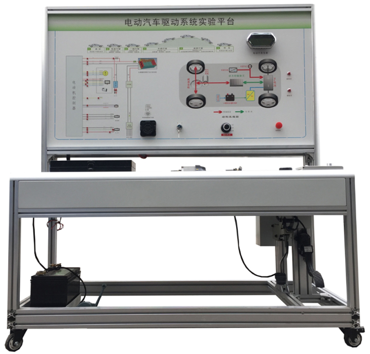 檢測控制面板(裝有各種檢測端子,1448×940mm彩色電路圖和工作原理示意圖)、組合儀表、點火開關(guān)、電機控制器、車載充電器與充電接口、DC-DC轉(zhuǎn)換器、鋰動力電池組、電動車電機(直流無刷電機)與變速箱、后輪左右液壓制動裝置、驅(qū)動橋傳動裝置、剎車開關(guān)、檔位開關(guān)、油門控制裝置、大電流繼電器、電源總開關(guān)、急停開關(guān)、輔助蓄電池(12V45AH)、一體化全鋁合金型材搭建的移動臺架(1500×700×1700mm (帶自鎖腳輪裝置,帶安裝檢測端子的原理面板,面板1448×940mm)、故障考核系統(tǒng)、設(shè)備操作說明書。