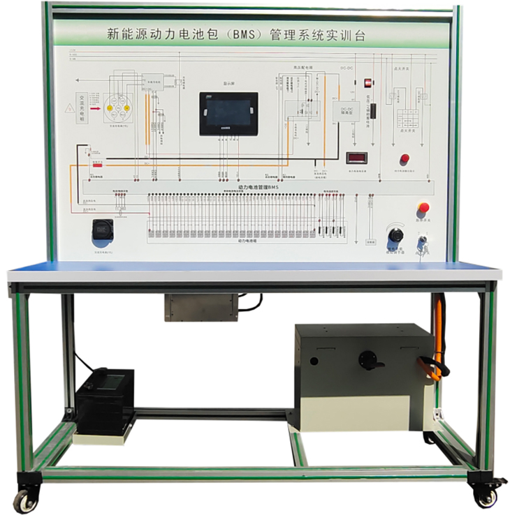 磷酸鐵鋰動力電池包與鐵制電池箱(單體電池3.2V 20AH,24串)、BMS鋰電管理一體機(jī)、動力電池包觸摸顯示屏、車載充電機(jī)、國標(biāo)充電插口、國標(biāo)充電槍、緊急斷電開關(guān)、霍爾電流傳感器、直流接觸器(包含充電繼電器、總正繼電器、總負(fù)繼電器、預(yù)充繼電器)、DC-DC轉(zhuǎn)換器(72V-12V30A)、輔助蓄電池(12V45AH)、放電控制繼電器與放電負(fù)載電阻、預(yù)充電阻器、可移動實訓(xùn)臺(1500×700×1700mm 帶自鎖腳輪裝置,帶安裝檢測端子的原理面板,面板1448×940mm)、故障模擬與排除裝置、設(shè)備操作說明書。