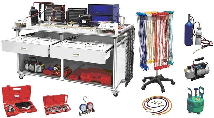 1、實訓臺采用鋁型材臺架加實訓模塊結構,裝置采用一體化設計,由導軌式鋁合金安裝平臺、空調系統(tǒng)、電冰箱系統(tǒng)、電氣控制系統(tǒng)等組成。底部安裝有四個帶剎車的腳輪,可以方便的移動和固定。設備配置空調制冷系統(tǒng)管路1套、直冷電冰箱制冷系統(tǒng)管路1套、安全插端子排,壓力表(1.5MPa)2只(3.5 MPa)2只等。