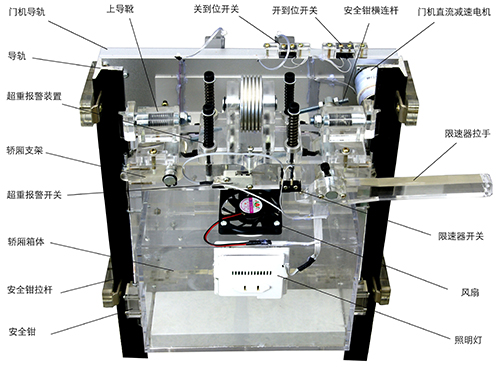 本公司設計的透明限速器,能調整到電梯模型實現(xiàn)限速器觸發(fā)安全鉗制動所需要的速度,真實演示電梯安全運行保護功能(電梯模型轎廂運行速度低于實際電梯的速度20-30倍)。由于實際電梯無法實現(xiàn)在故障狀態(tài)下的超速運行,因此永遠無法真實演示限速器觸發(fā)安全鉗制動的安全運行保護功能,讓學生觀察了解安全運行保護機電聯(lián)合控制的過程。