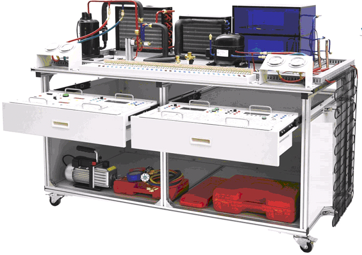 1.該裝置集制冷空調(diào)系統(tǒng)安裝、冰箱系統(tǒng)安裝、制冷系統(tǒng)電接線、壓力檢漏、抽真空、 充注制冷劑與運(yùn)行調(diào)試于一體,包含了制冷系統(tǒng)維修的全部步驟,能滿足實(shí)訓(xùn)教學(xué)、實(shí)際工程訓(xùn)練及職業(yè)技能競(jìng)賽的需要。