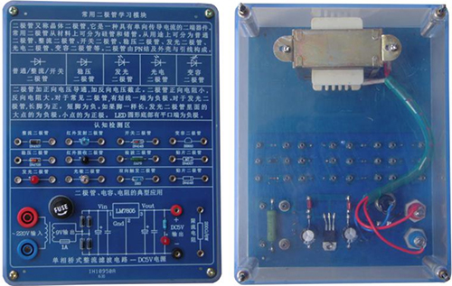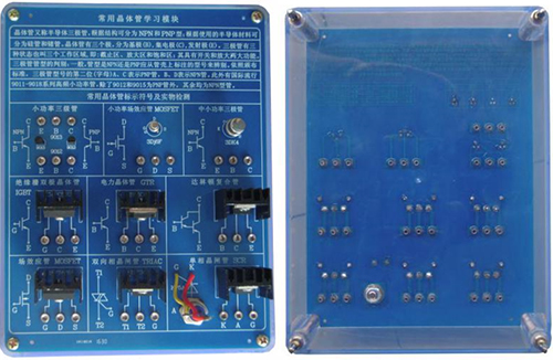 底盒使用190mm×145mm的開模有機透明塑料底盒,模塊面板采用印制電路板PCB工藝,可以直觀看到器件的實物及相關的原理介紹。對于典型應用及易損器件安裝在面板背面,透過透明底盒能夠看到器件實物,方便感性認識、檢測測試,同時也能防止器件的損傷。