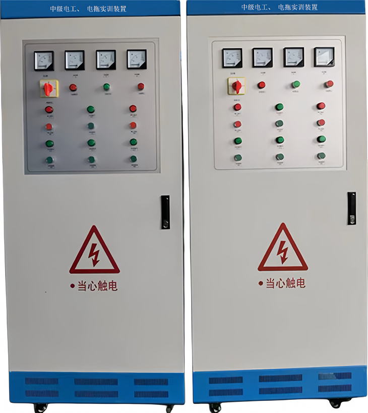 中級電工、電拖實訓考核裝置按標準電氣控制柜設計制造規(guī)格,充分利用雙面位置,柜內(nèi)裝有完成各種照明電路所需的單相電度表、日光燈、單聯(lián)開關、插座、感應開關、漏電開關等,以及電氣控制所需要的多種低壓電器,如漏電斷路器、熔斷器、電流互感器、交流接觸器、時間繼電器、熱繼電器、中間繼電器、行程開關、按鈕、信號燈、轉(zhuǎn)換開關、電壓表、電流表、功率表及電度表等,為了延長電器使用壽命,各電器的接點都與接線端子相連,再由接線端子與被控制電氣連接。